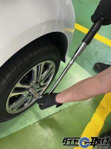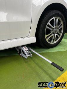 ナットを緩めたら、いよいよジャッキアップです。 車の下部にジャッキポイントがありますので、そこにジャッキを引っかけて車体を持ち上げます。 慣れてくると、触っただけでどこがジャッキポイントかわかりますが、最初のうちは取扱説明書などで確認するようにしましょう。 ジャッキアップは、タイヤが少し浮いている程度になれば十分です。 上げすぎると事故やけがのリスクが高くなりますので注意してください。
